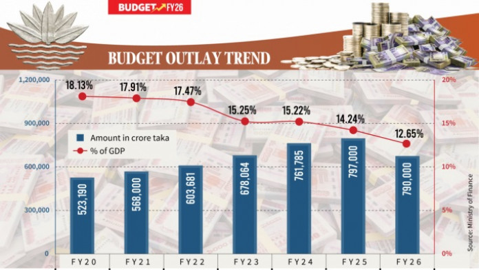 অন্তর্বর্তী সরকারের অর্থ উপদেষ্টা সালেহউদ্দিন আহমেদ গত ২ জুন ২০২৫-২৬ অর্থবছরের জন্য ৭ লাখ ৯০ হাজার কোটি টাকার বাজেট প্রস্তাব উপস্থাপন করেন,যা পরে উপদেষ্টা পরিষদের সভায় অনুমোদন করা হয়। আগের অর্থবছর ২০২৪-২৫ অর্থবছরের মূল বাজেটের চেয়ে ৭ হাজার কোটি টাকা কম এবং সংশোধিত বাজেটের (৭ লাখ ৪৪ হাজার কোটি টাকা) চেয়ে ৬ দশমিক ১৮ শতাংশ বেশি।
