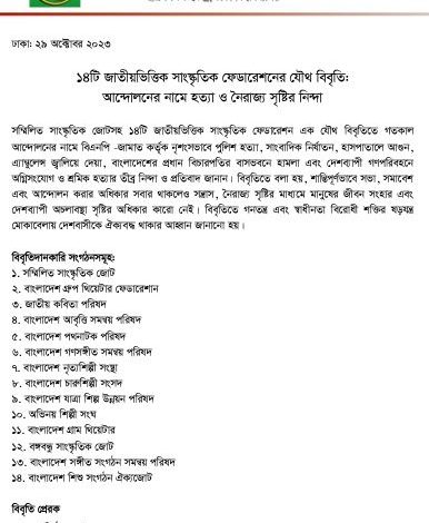 আন্দোলনের নামে হত্যা ও নৈরাজ্য সৃষ্টির ঘটনায় ১৪টি সাংস্কৃতিক ফেডারেশনের নিন্দা