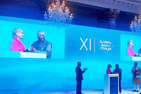 একাদশ বিশ্ব বাকু ফোরামে বিশেষ বক্তা হিসেবে ভাষণ দিয়েছেন শান্তিতে নোবেলজয়ী অর্থনীতিবিদ ড. মুহাম্মদ ইউনূস। সম্মেলনের শেষ দিন তাঁকে জাতিসংঘের শিক্ষা, বিজ্ঞান ও সংস্কৃতিবিষয়ক সংস্থা ইউনেসকোর ‘দ্য ট্রি অব পিস’ পুরস্কারে ভূষিত করা হয়। সম্মেলনের সমাপনী নৈশভোজে তাঁর হাতে এই সম্মাননা তুলে দেওয়া হয়। গতকাল বৃহস্পতিবার ইউনূস সেন্টারের এক সংবাদ বিজ্ঞপ্তিতে এসব তথ্য জানানো হয়।