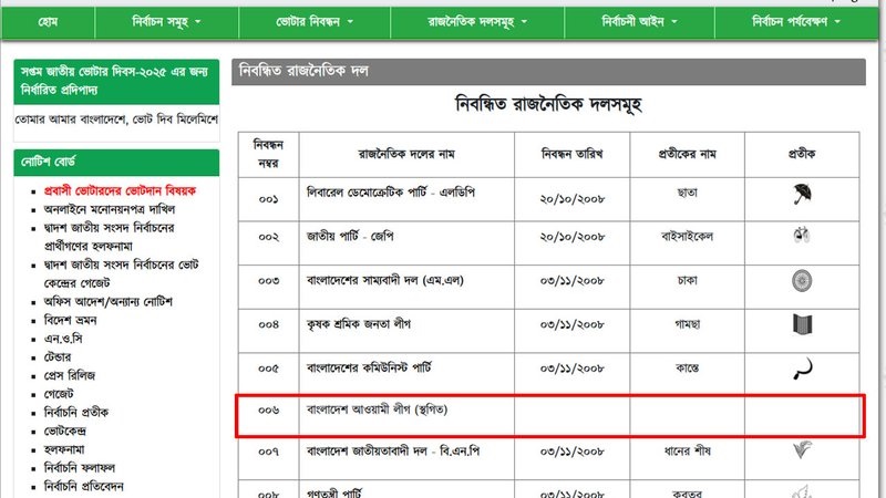 নিবন্ধিত রাজনৈতিক দলগুলোর তালিকার ৬ নম্বর ট্যাবে আওয়ামী লীগের (স্থগিত) নামটি থাকলেও প্রতীক প্রদর্শনের স্থানে কোনো চিহ্ন বা ছবি আর দেখা যাচ্ছে না।
