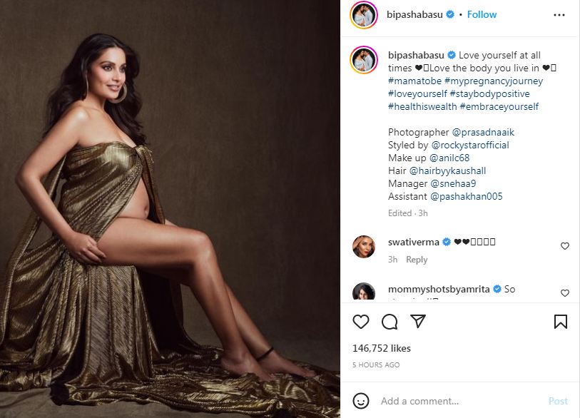 শুক্রবার (৪ নভেম্বর) দুপুরে বিপাশা সামাজিক যোগাযোগমাধ্যমে একটি ছবি প্রকাশ করেন। তাতে দেখা যায়, সোনালি রঙের একটি ঢিলেঢালা পোশাক পরে আছেন বিপাশা। খোলামেলা পোশাক হওয়ায় স্পষ্ট তার বেবি বাম্প।