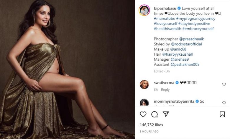 শুক্রবার (৪ নভেম্বর) দুপুরে বিপাশা সামাজিক যোগাযোগমাধ্যমে একটি ছবি প্রকাশ করেন। তাতে দেখা যায়, সোনালি রঙের একটি ঢিলেঢালা পোশাক পরে আছেন বিপাশা। খোলামেলা পোশাক হওয়ায় স্পষ্ট তার বেবি বাম্প।