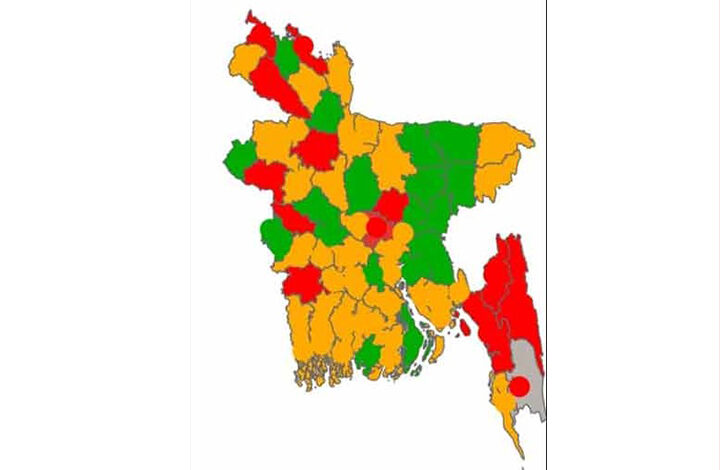 এ ছাড়া মধ্যম ঝুঁকিতে থাকা ৩২ জেলা হলো- সিলেট, ফেনী, নারায়ণগঞ্জ, নোয়াখালী, কক্সবাজার, মৌলভীবাজার, ফরিদপুর, মুন্সীগঞ্জ, লক্ষ্মীপুর, শরীয়তপুর, ময়মনসিংহ, খুলনা, বরিশাল, মানিকগঞ্জ, সিরাজগঞ্জ, গোপালগঞ্জ, রংপুর, জামালপুর, নওগাঁ, ঝিনাইদাহ, নাটোর, সাতক্ষীরা, পিরোজপুর, বাগেরহাট, মাগুরা, নড়াইল, পটুয়াখালী, কুড়িগ্রাম, জয়পুরহাট, শেরপুর, ঝালকাঠি ও ঠাকুরগাঁও।