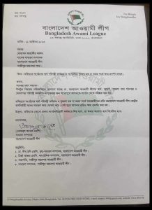 শনিবার আওয়ামী লীগের সাধারণ সম্পাদক ওবায়দুল কাদের স্বাক্ষরিত এক চিঠিতে এ বিষয়টি জানানো হয়।