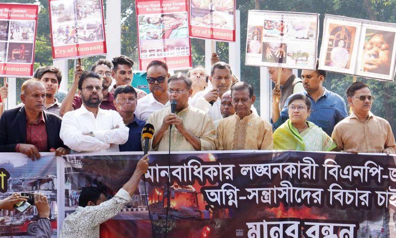 রোববার দুপুরে রাজধানীতে কেন্দ্রীয় শহীদ মিনার প্রাঙ্গণে ‘অগ্নিসন্ত্রাসের আর্তনাদ’ সংগঠন আয়োজিত ‘মানবাধিকার লংঘনকারী বিএনপি-জামায়াতের অগ্নিসন্ত্রাসী ও হুকুমদাতাদের বিচার চাই’ শীর্ষক মানববন্ধন ও সমাবেশে প্রধান অতিথির বক্তৃতায় তিনি এ সব কথা বলেন।