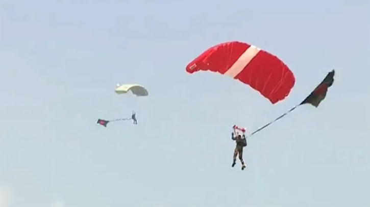 মঙ্গলবার (১৬ ডিসেম্বর) দুপুর ১২টার দিকে তেজগাঁও পুরাতন বিমানবন্দরে আয়োজিত বিজয় দিবসের অনুষ্ঠানে এই ব্যতিক্রমধর্মী প্যারাস্যুটিং অনুষ্ঠিত হয়।