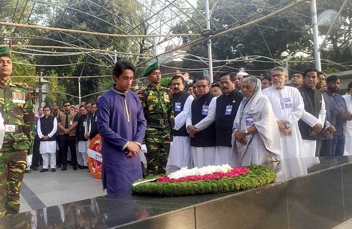 প্রধানমন্ত্রীর পক্ষে বঙ্গবন্ধুর প্রতিকৃতিতে রাদওয়ান মুজিব সিদ্দিক ববির শ্রদ্ধা