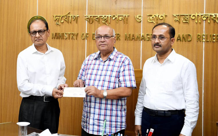 প্রধান উপদেষ্টার পক্ষে দুর্যোগ ব্যবস্থাপনা ও ত্রাণ মন্ত্রণালয়ের উপদেষ্টা নিজ কার্যালয়ে অনুদানের চেক গ্রহণ করেন।