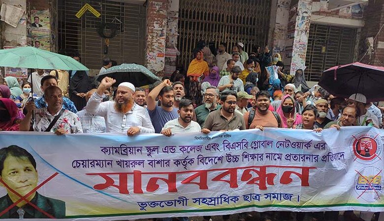 বিদেশে উচ্চশিক্ষার নামে হাজার কোটি টাকা প্রতারণার অভিযোগে ক্যামব্রিয়ান এডুকেশন গ্রুপের চেয়ারম্যান মো. খায়রুল বাশারের বিচারের দাবিতে মানববন্ধন করেছেন ভুক্তভোগীরা।