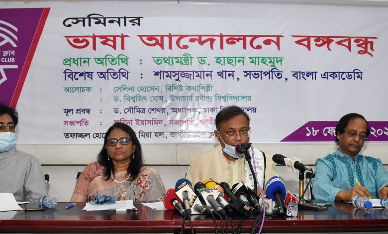 বৃহস্পতিবার (১৮ ফেব্রুয়ারি) দুপুরে রাজধানীর তোপখানা রোডে, জাতীয় প্রেসক্লাবের তফাজ্জল হোসেন মানিক মিয়া হলে বঙ্গবন্ধুর জন্মশতবর্ষ উপলক্ষে প্রেসক্লাব আয়োজিত ‘ভাষা আন্দোলনে বঙ্গবন্ধু’ সেমিনারে প্রধান অতিথির বক্তৃতায় তিনি একথা বলেন।