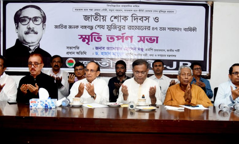 জাতীয় পার্টি-জেপি চেয়ারম্যান আনোয়ার হোসেন মঞ্জুর সভাপতিত্বে বুধবার সন্ধ্যায় রাজধানীতে জাতীয় প্রেসক্লাবে জেপি আয়োজিত ‘জাতীয় শোক দিবস ও জাতির পিতার ৪৭তম শাহাদাৎ বার্ষিকী উপলক্ষে স্মৃতি তর্পণ সভা’য় প্রধান অতিথির বক্তৃতায় তিনি এ আহ্বান জানান।