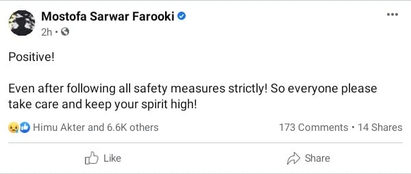 তিনি লিখেছেন, ‘পজিটিভ, সমস্ত নিরাপত্তা ব্যবস্থা কঠোরভাবে অনুসরণ করার পরেও! তাই দয়া করে সবাই নিজের যত্ন নিন এবং মনোবল শক্ত রাখুন।’