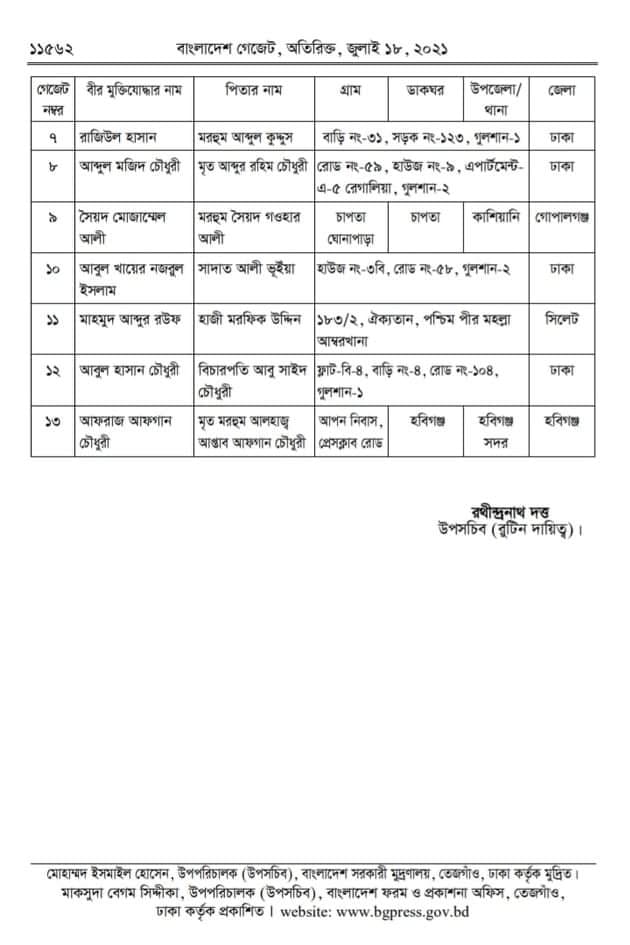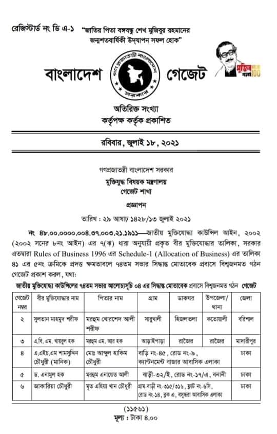 বিজ্ঞপ্তিতে জানানো হয়, গত ১৩ জুলাই মুক্তিযুদ্ধ বিষয়ক মন্ত্রণালয় থেকে এ বিষয়ে গেজেট প্রকাশ করা হয়েছে। সে অনুযায়ী, মুক্তিযোদ্ধা হিসেবে প্রবাসে বিশ্ব জনমত গঠন গেজেটে অন্তর্ভূক্ত ১২ জনের মধ্যে গেজেট নং-২ যুক্তরাজ্য আওয়ামী লীগের সভাপতি সুলতান মাহমুদ শরীফ, গেজেট নং-৩ সাবেক প্রধান বিচারপতি এবিএম খায়রুল হক,