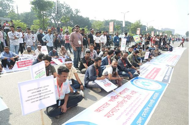 রাজধানীর আগারগাঁওয়ে বাংলাদেশ টেলিযোগাযোগ নিয়ন্ত্রণ কমিশন (বিটিআরসি) ভবনের সামনে মোবাইল ফোন ব্যবসায়ীদের অবস্থান চলছে রবিবার (৭ ডিসেম্ব) সকাল থেকে। এতে ওই ভবনসংলগ্ন সড়ক ও আশপাশের সড়কগুলোয় দেখা দিয়েছে তীব্র যানজট।