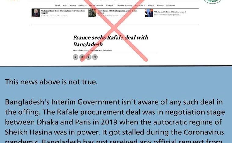 বাংলাদেশ ও ফ্রান্সের মধ্যে অত্যাধুনিক ‘রাফাল’ যুদ্ধবিমান ক্রয়সংক্রান্ত চুক্তি নিয়ে ভারতীয় সংবাদমাধ্যম দ্য সানডে গার্ডিয়ান যে সংবাদ প্রকাশ করেছে তা সত্য নয় বলে জানিয়েছে বাংলাদেশের প্রধান উপদেষ্টার প্রেস উইং।