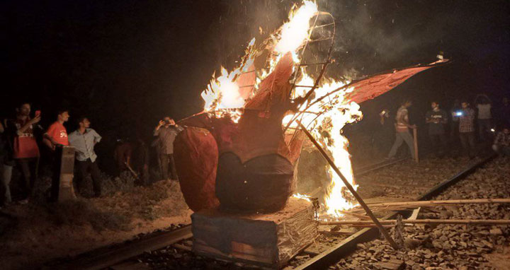প্রত্যক্ষদর্শীরা জানান, সন্ধ্যা সাড়ে সাতটার দিকে শিক্ষার্থীরা বিশ্ববিদ্যালয়ের মেইন গেট থেকে চারুকলা অনুষদের দিকে যান। আটটার দিকে চারুকলা অনুষদ থেকে বাশ ও কাগজের তৈরী পুতুল বা ডামি নিয়ে এসে রেললাইনের উপর জ্বালিয়ে দেয় তারা।