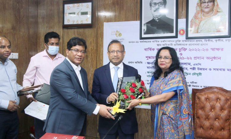 আজ মঙ্গলবার মন্ত্রণালয়ে স্থানীয় সরকার বিভাগের সম্মেলন কক্ষে আয়োজিত ২০২২-২০২৩ অর্থবছরের বার্ষিক কর্মসম্পাদন চুক্তি স্বাক্ষর ও শুদ্ধাচার পুরস্কার ২০২১-২০২২ প্রদান অনুষ্ঠানে শুদ্ধাচার পুরস্কারের সন্মাননা ও সনদ তুলে দেন স্থানীয় সরকার, পল্লী উন্নয়ন ও সমবায় মন্ত্রী মো. তাজুল ইসলাম।