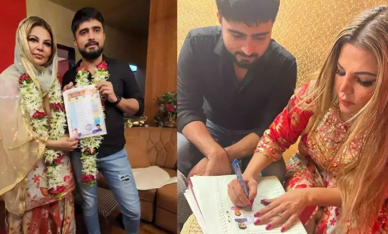 ভাইরাল হওয়া বিয়ের একটি ছবিতে দেখা যাচ্ছে, রেজিস্ট্রির কাগজ হাতে দাঁড়িয়ে রয়েছেন রাখি ও আদিল। তাদের দুজনের গলায়ই শোভা পাচ্ছে বরমালা।