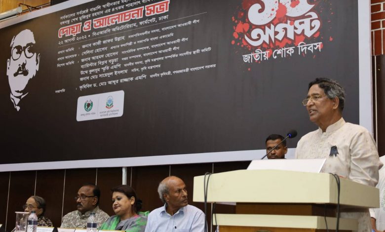আজ সোমবার বিকালে রাজধানীর ফার্মগেটে বাংলাদেশ কৃষি গবেষণা কাউন্সিল (বিএআরসি) মিলনায়তনে জাতীয় শোক দিবস উপলক্ষে বঙ্গবন্ধু কৃষিবিদ পরিষদ ও বাংলাদেশ কৃষি বিশ্ববিদ্যালয় অ্যালামনাই এসোসিয়েশন আয়োজিত আলোচনা ও দোয়া অনুষ্ঠানে মন্ত্রী এসব কথা বলেন।