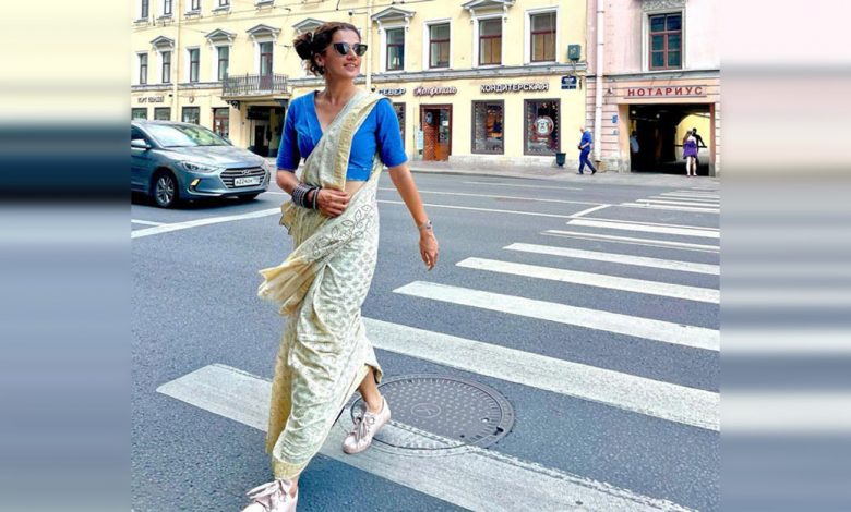 সেন্ট পিটার্সবার্গের রাস্তায়, সাদা সুতির শাড়ি, নীল ব্লাউজ, পায়ে স্নিকার, ছুটতে ছুটতে রাস্তা পার হচ্ছেন জনপ্রিয় নায়িকা তাপসী পান্নু।